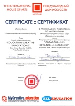 Елене Леонидовне выдан сертификат о прохождении подготовки по направлению «Инновационная деятельность в сфере образования и культуры» в рамках Международной научно-практической конференции «Образование – Креатив – Инновации»